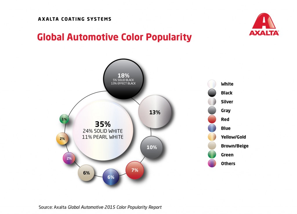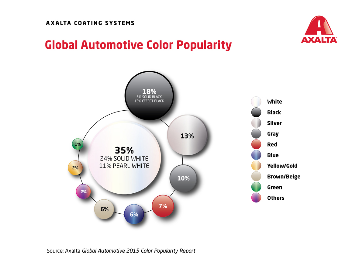 Axalta Coating Systems has released its Global Automotive 2015 Color Popularity Report which shows that white continues to increase in popularity and holds onto the top position worldwide.