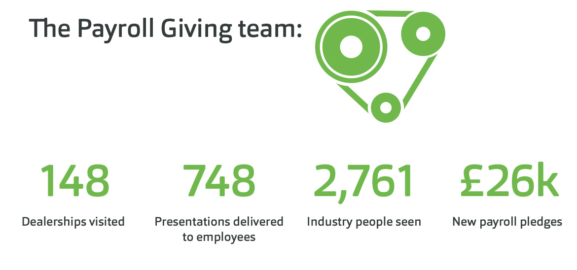 Ben’s impact report showed that, during the quarter, Ben’s payroll giving team visited 148 dealerships, delivered 748 presentations to 2,761 employees in the industry, resulting in a total of £26,000 new payroll pledges.