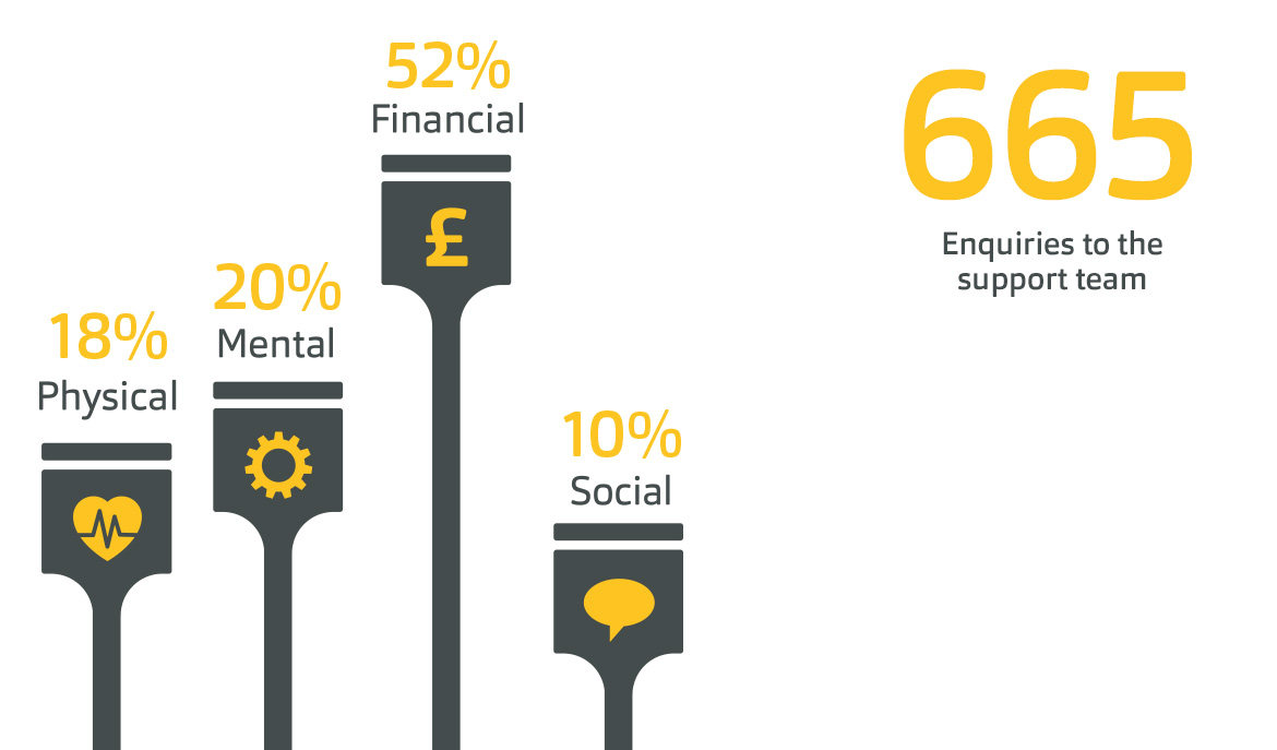 Financial issues remained the top concern, making up 52% of all enquiries, although the increase in the number of mental health calls made it the second biggest reason people contact the charity. This could be attributed to a rising awareness of the issue following Ben’s mental health campaign, which run from October to December and culminated in the organisation’s first ever national industry fundraising event, Hats on 4 Mental Health Day.