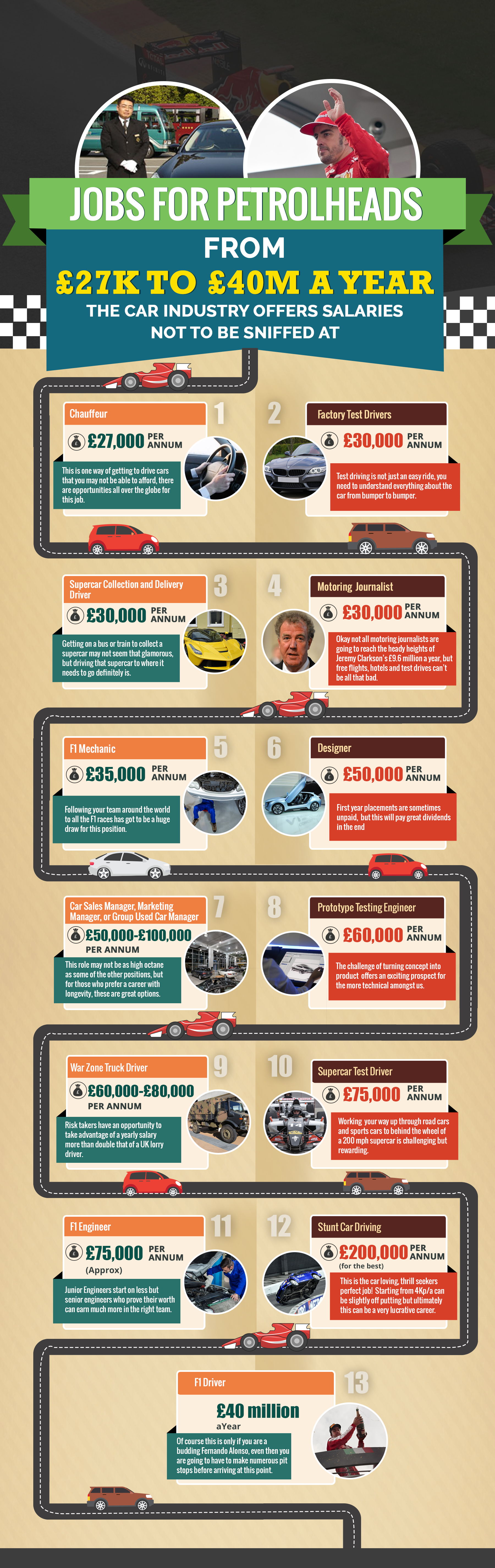 It suggests vehicle-related jobs are broadly separated into four categories – driving, technical, academic and management – with potential earnings ranging from £27,000pa for a private chauffeur to £40m if you happen to be a budding Fernando Alonso.