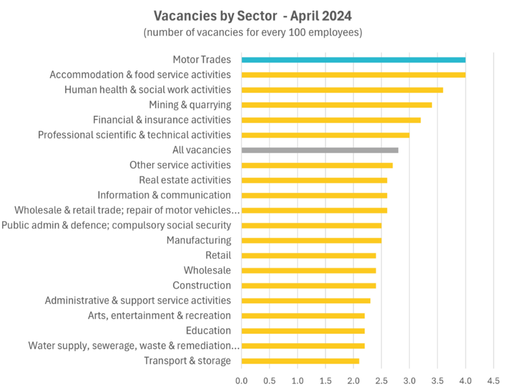 For every 100 motor trades employees there are four vacancies, down from 4.1 last month, according to the Institute of the Motor Industry (IMI).