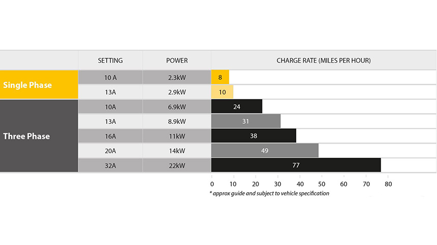 The Super Pro EV Charger can be used on both 230V and 400V sockets, allowing you to recharge vehicles as quickly as possible, based on the socket available. Whilst the maximum charging rate is 22kW, this can be reduced where the EV is unable to charge at this rate, as some can only operate at 11kW or 7kW. The table below shows the approx. charge rate that this would deliver in miles of charge per hour.
