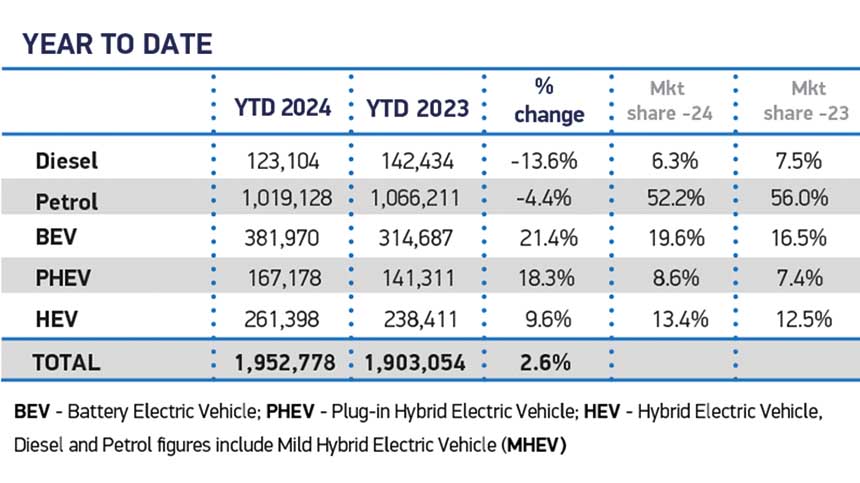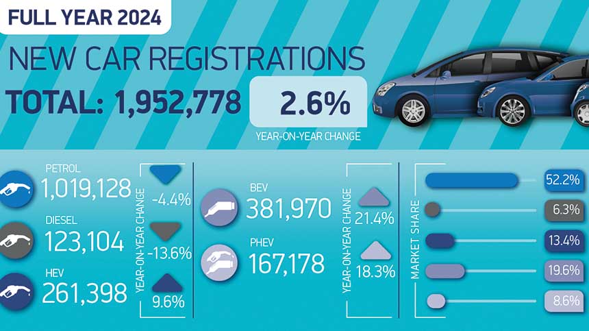 The Society of Motor Manufacturers and Traders has published the 2024 new car sales figures, revealing growth of 2.6% to 1,952,778 units.