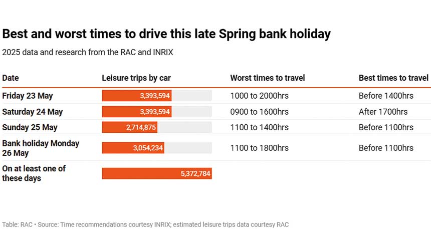 RAC Mobile Mechanic Aaron Bryan said: “Our research shows it really is best to leave as early or late as possible this bank holiday weekend, as the majority of motorists are planning to set off in the morning.