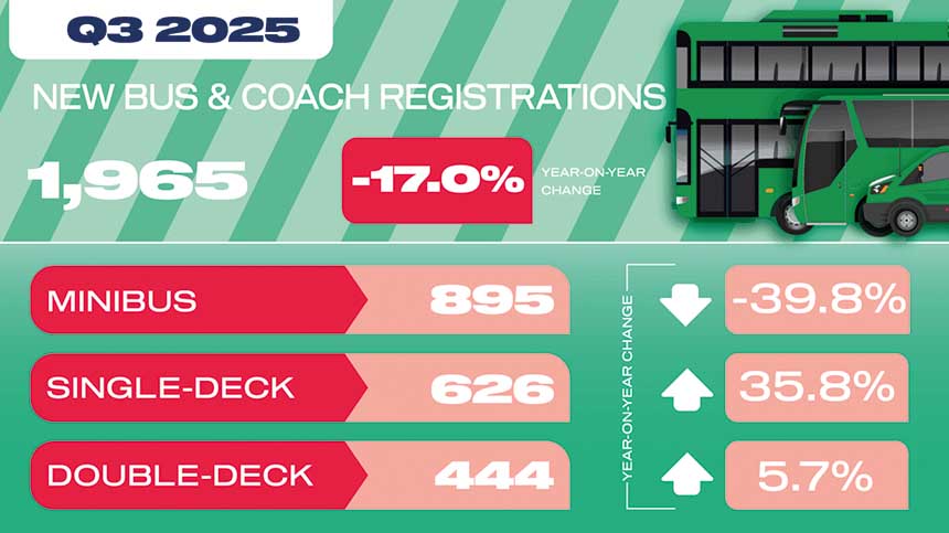 The decline marks the end of nine consecutive quarters of growth, with falling minibus registrations down 39.8% to 895 units following strong growth in the same period last year. However, single and double-deck bus and coach registrations both rose, up 35.8% and 5.7% to 626 and 444 units respectively.
