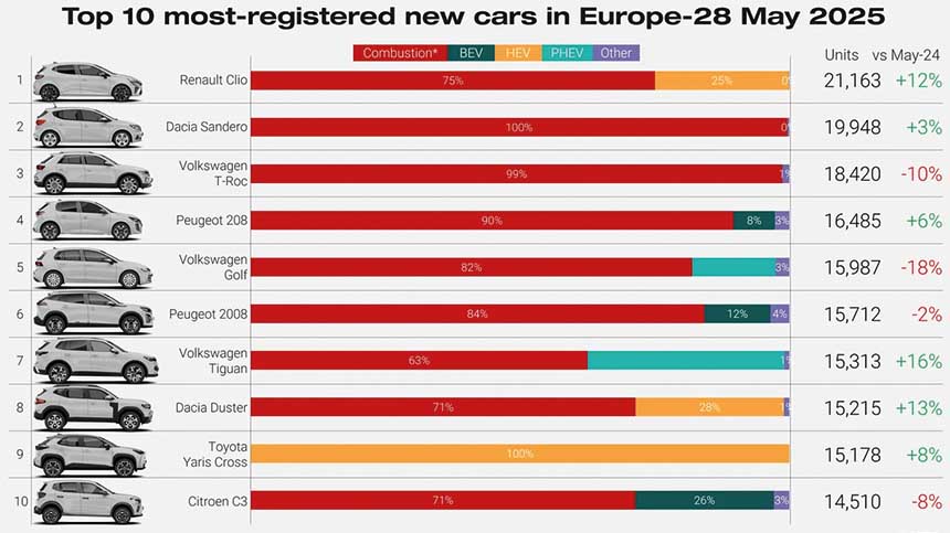 These figures contributed to a 2.5% year-on-year increase in new car sales across 28 European markets. A total of 1,107,517 new vehicles were registered, bringing the year-to-date figure to 5,535,831 units. This represents an increase of 0.7% compared to the same period in 2024.