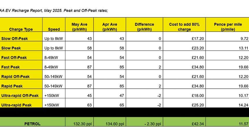 According to the latest AA EV Recharge Report, peak and off-peak charging at the fastest speeds have come down by 2p, while average petrol prices have risen by around 2p a litre in the last week as a result of the Iran-Israel conflict.