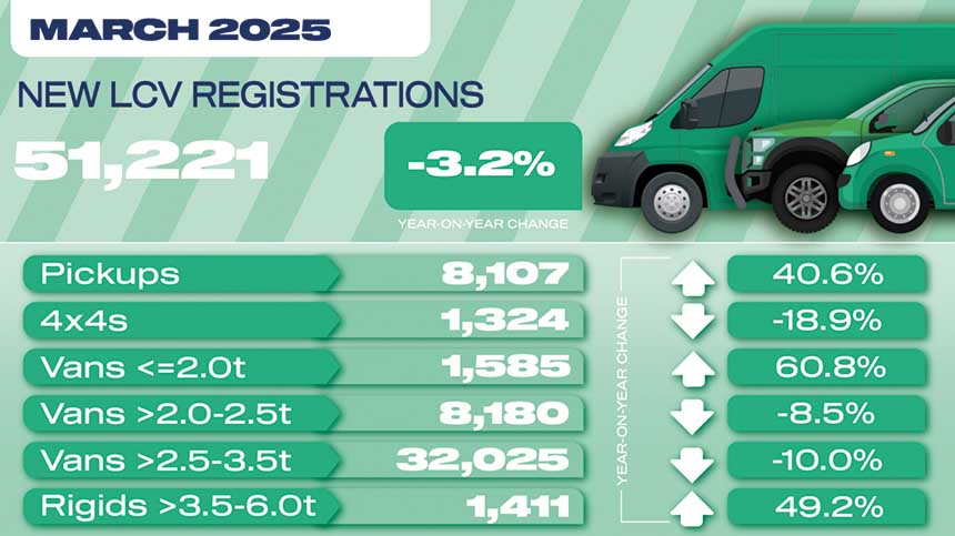 LCV sales fell by 3.2% in March to 51,221 units, according to new figures released by the Society of Motor Manufacturers and Traders (SMMT).