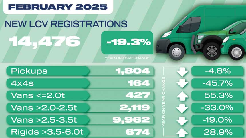 New light commercial vehicle sales fell by 19.3% to 14,476 units in February, according to figures from the Society of Motor Manufacturers and Traders (SMMT).
