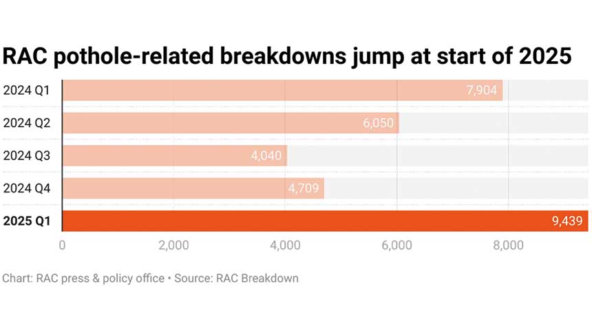 The RAC has attended more than double the number of pothole-related breakdowns in the first quarter of 2025 compared to the last quarter of 2024.