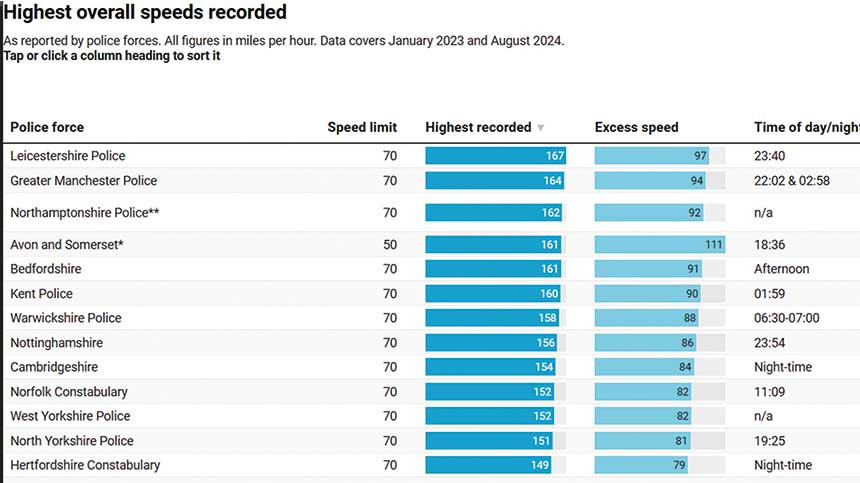 The highest recorded speed on any road was 167mph on a 70mph stretch of the M1 by Leicestershire Police, while Somerset Police recorded a driver going 161mph on a 50mph stretch of the A303.