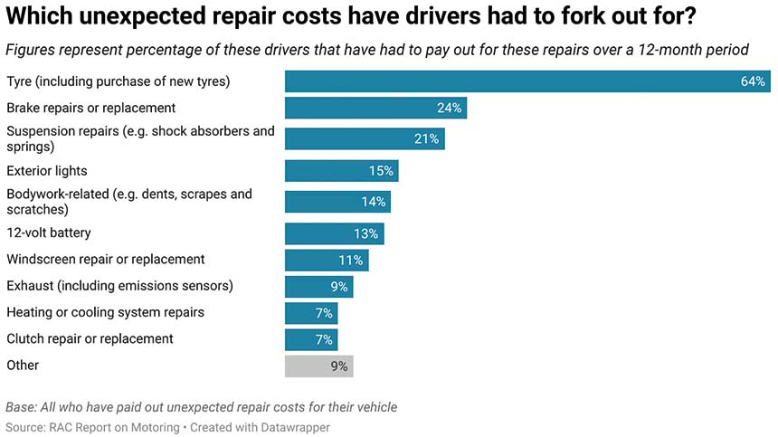 The research revealed that tyres top the list of unexpected motoring costs (64%), followed by brake repairs (24%), and damage to suspension parts such as shock absorbers and springs (21%).