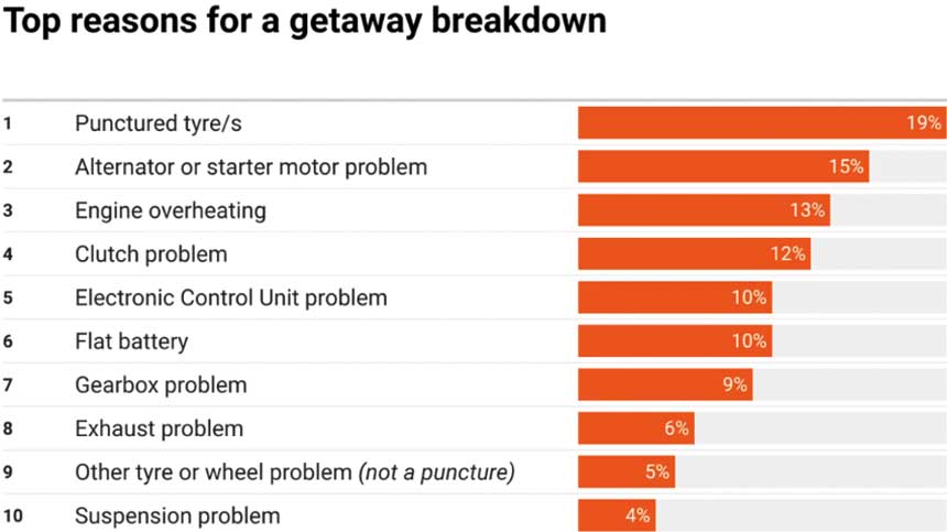 A further 15% had alternator and starter motor issues and 13% said their vehicles overheated on long journeys.